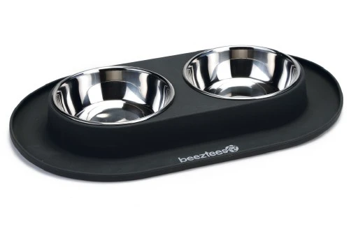 Beeztees Siliconen RVS Dinerset Antraciet Makkelijk afwasbare dinerset. De RVS bakjes zijn uitneembaar en vaatwasbestendig. Door de siliconen onderzijde schuift de dinerset niet over de vloer. Afmeting dinerset: 40x24cm Inhoud per bakje: 500ml