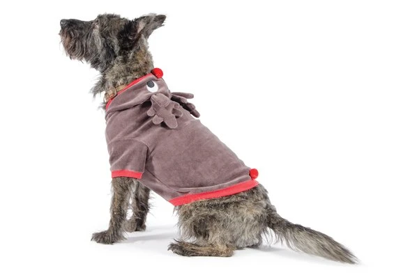Hondenjas Rendier Uw hond zal er fantastisch uitzien in dit leuke hondenjasje ! Het is in bruin uitgevoerd met kerstrode biezen. De jas is gemaakt van heerlijk warm fleece en erg leuk afgewerkt met een opvallend rendier op de rug. Leverbaar in de volgende maten: Bepaal de juiste maat voor uw hond: